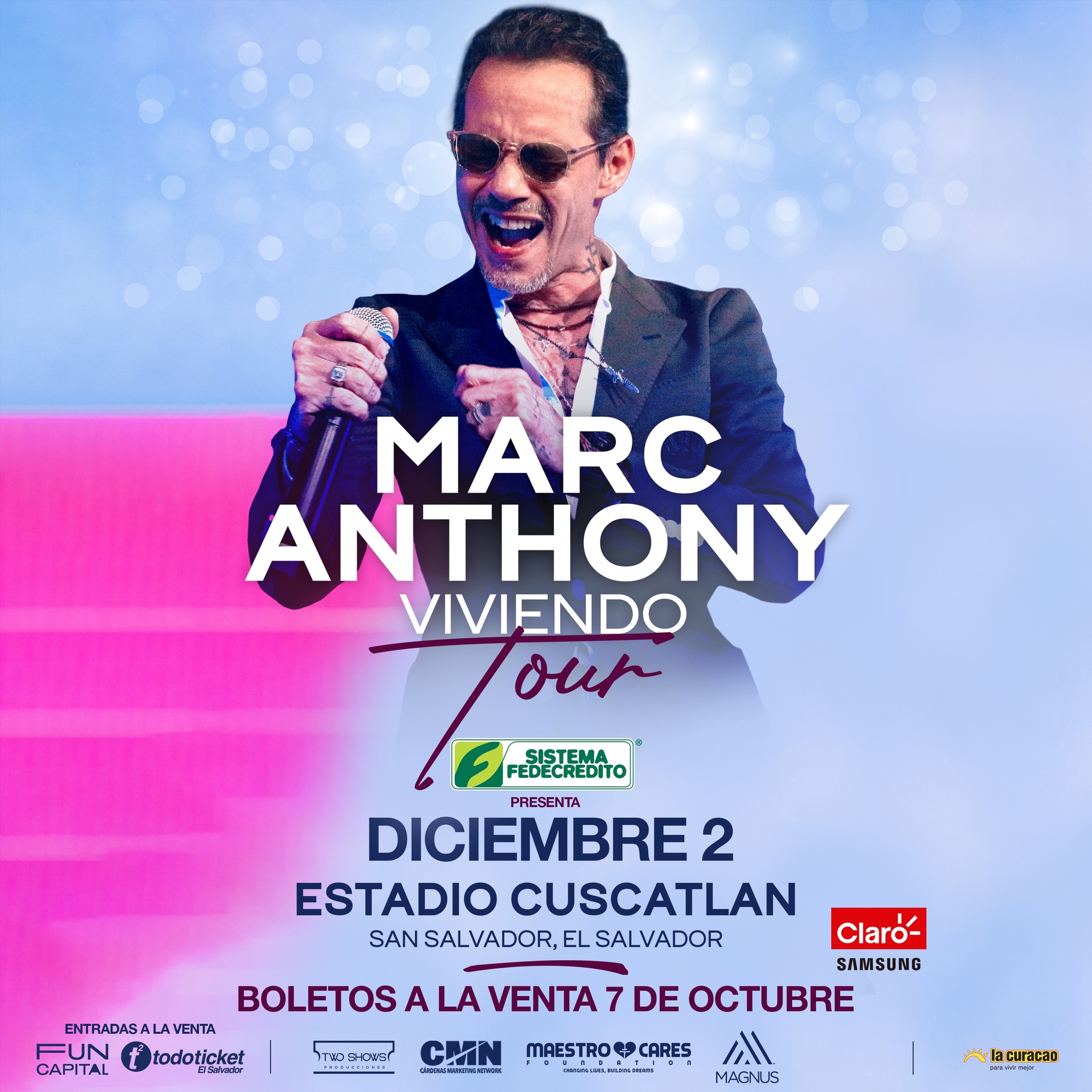 Esta tarde la productora «Two Shows Producciones», quién es la encargada de traer a El Salvador al cantautor puertorriqueño, Marc Anthony, dio a conocer los precios y localidades que estarán disponible para su esperado concierto, el cual se llevará a cabo el próximo 02 de diciembre, en el Estadio Cuscatlán.