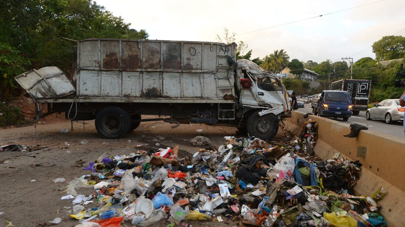 Este martes la Policía Nacional Civil (PNC) y Cruz Roja Salvadoreña se hicieron presente luego de haber sido reportado un accidente. Un camión que transportaba basura volcó en la intersección entre la 50 avenida norte y calle Agua Caliente, en San Salvador Este. En el siniestro no se reportaron personas lesionados.