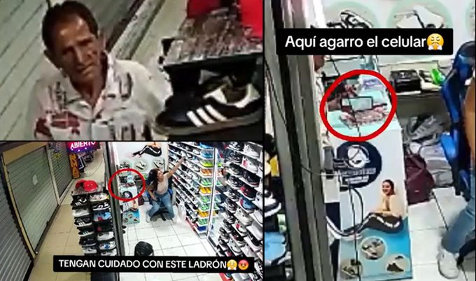En el video se puede observar a la encargada de la tienda que se encontraba sola cuando el hombre ingreso haciéndose pasar por comprador, le preguntó por un modelo de zapatos y aprovechando un descuido, tomó rápidamente el celular que estaba colocado sobre una vitrina.