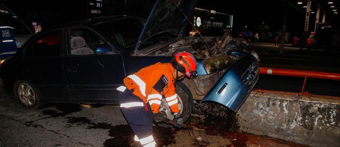 Un automovilista sufrió múltiples lesiones tras impactar contra la valla de seguridad sobre la 49 avenida Sur, en San Salvador, la noche del domingo. Se trató de un sujeto que colisionó frontalmente contra la valla del puente cuando intentaba incorporarse a la alameda Roosevelt.
